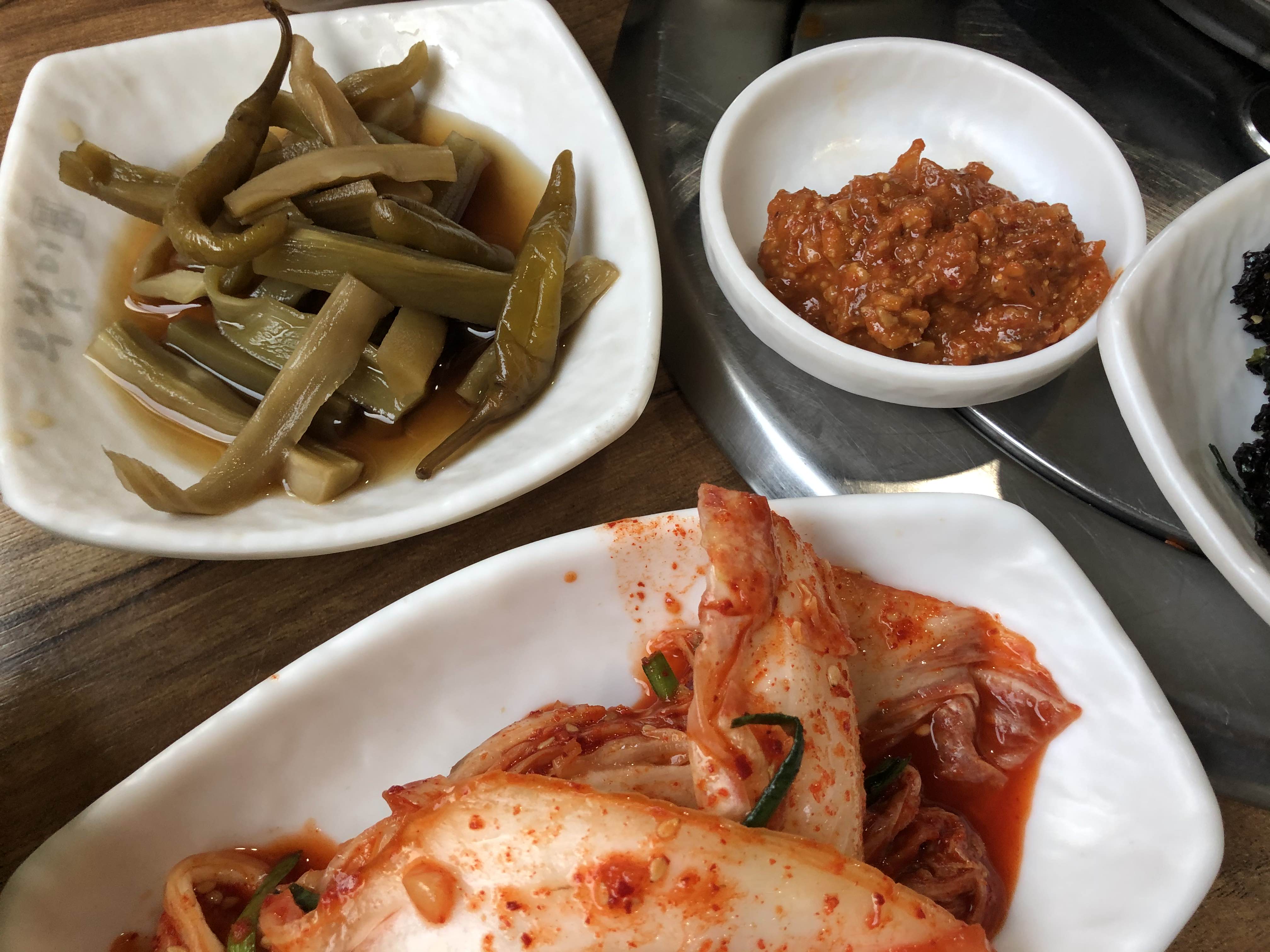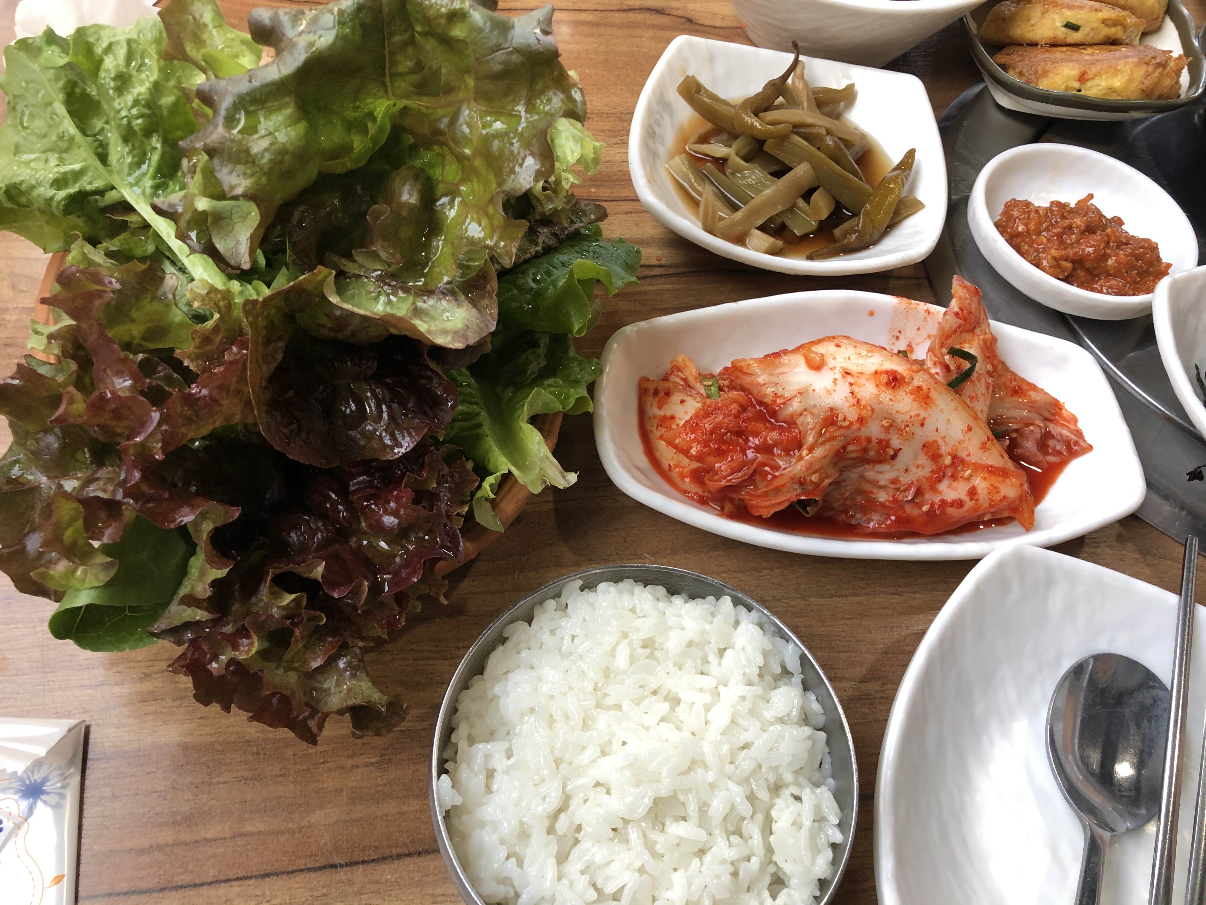 쌈채소부터 시작해서 여러 가지 갖가지 밑반찬들이 나온다