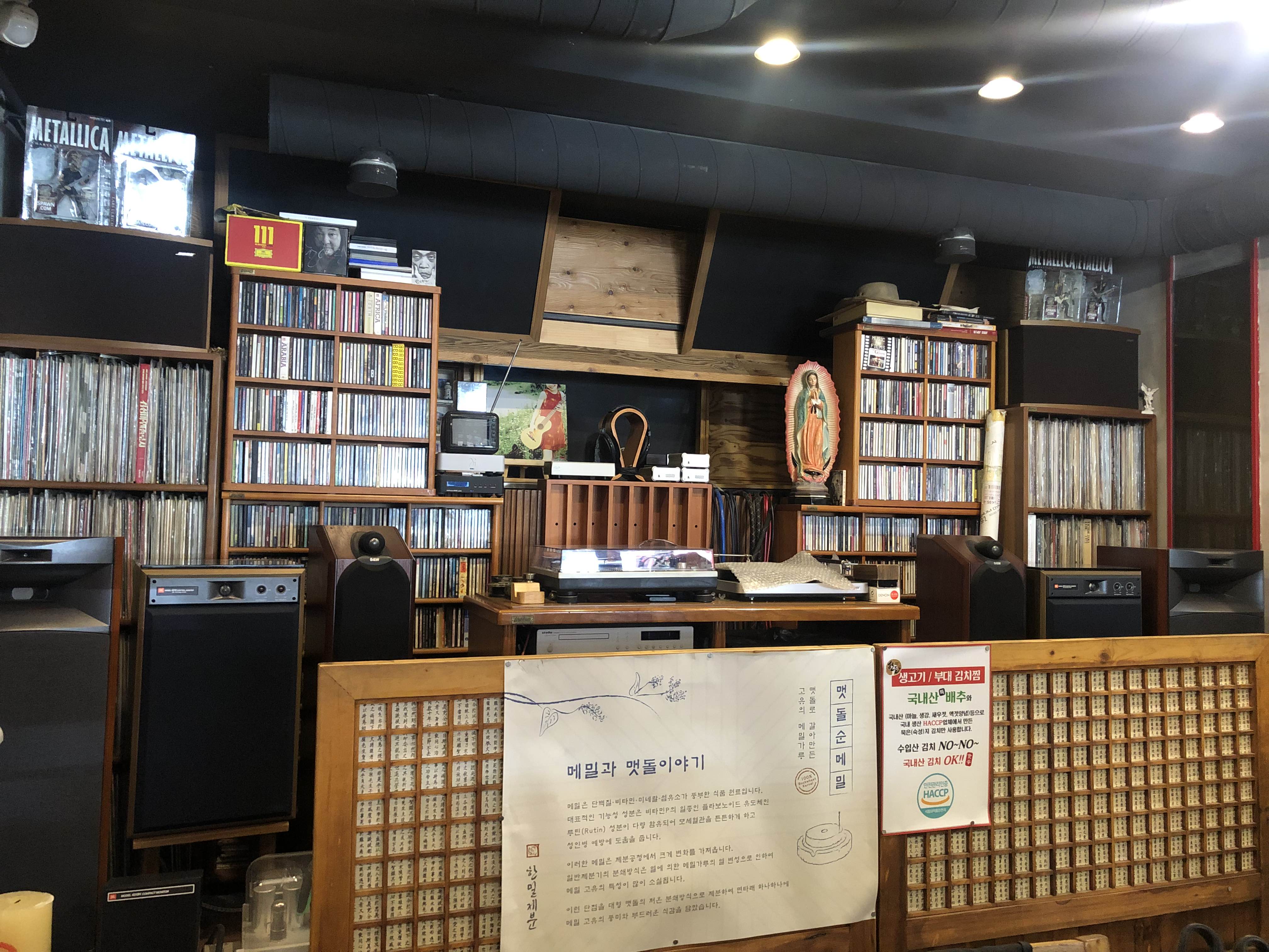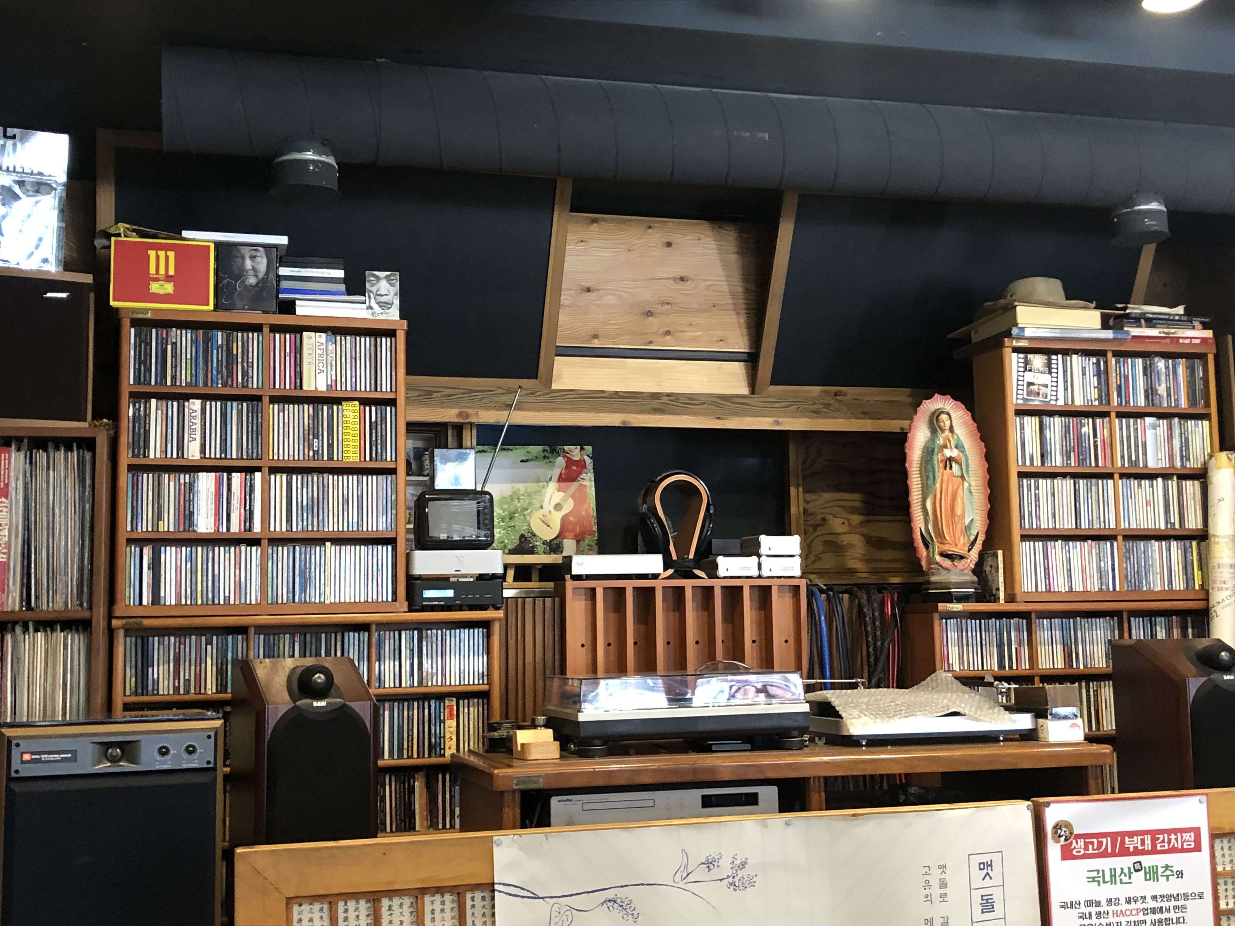벽면에 앨범이 잔뜩 있는 인테리어가 신기했다